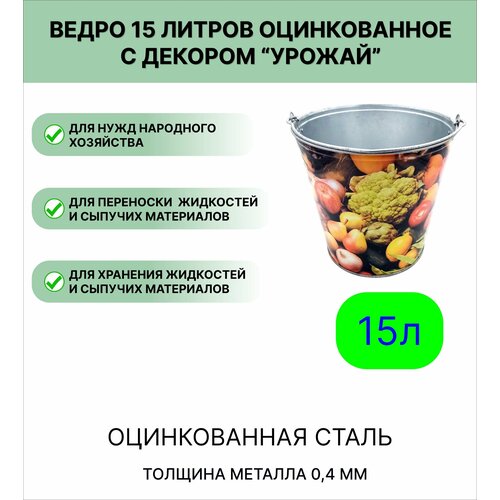 Ведро оцинкованное объемом 15 литров с декором производится компанией УралИнвест по ГОСТ 20558-82. Ведро изготавливается из тонколистового оцинкованного проката и предназначено для нужд народного хозяйства, хранения и переноски холодной воды и ГСМ. Ведро оцинкованное не предназначено для хранения и транспортирования пищевых продуктов.