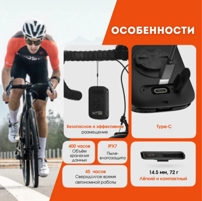 GPS-трекер, взаимодействие со смартфонами Android, взаимодействие со смартфонами iOS, память на два велосипеда, подключение к компьютеру, подсветка дисплея
