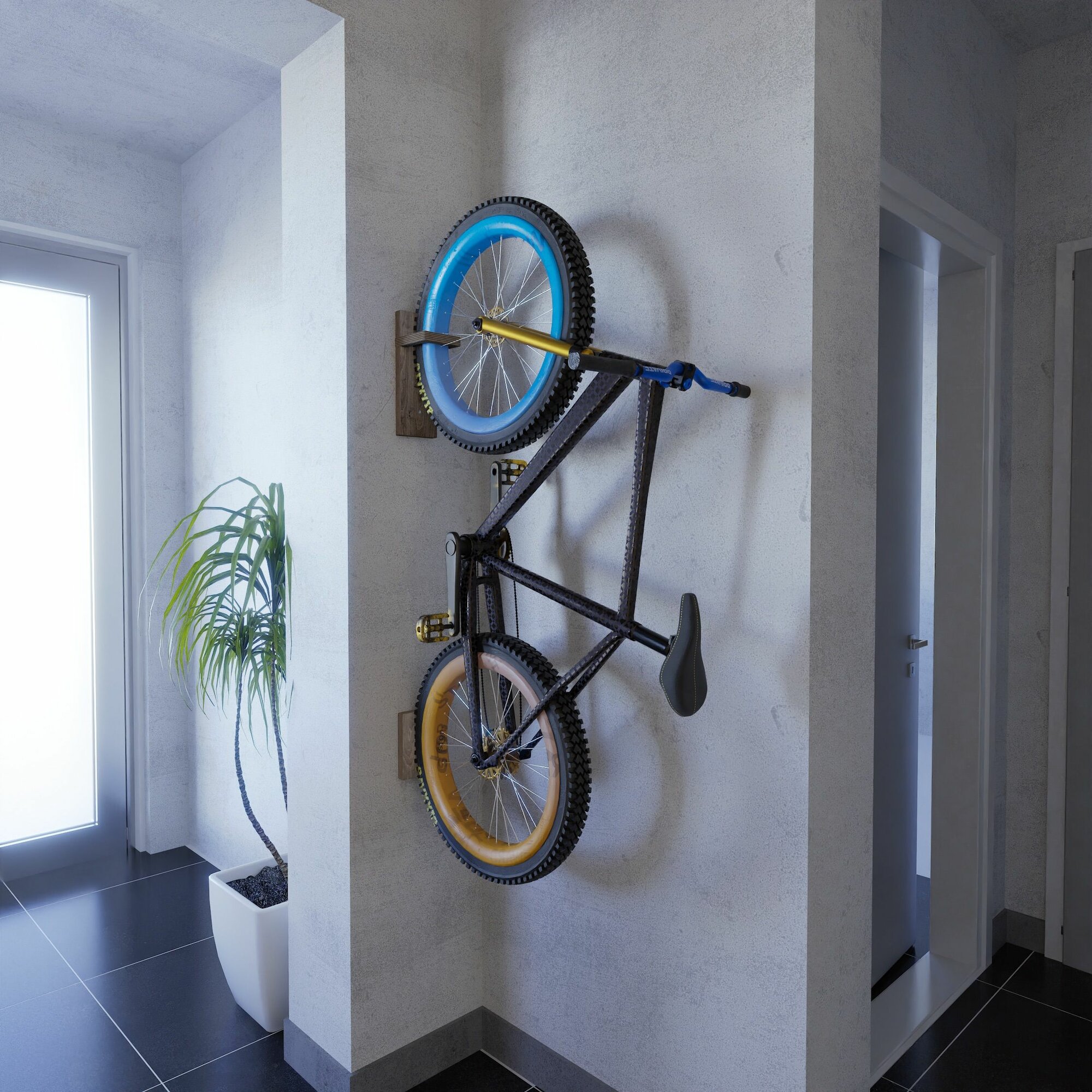 Настенный кронштейн для велосипеда от Nord Bros - это современное и практичное решение для хранения вашего двухколесного друга. Изготовленный из качественной фанеры и обработанный темным маслом, он обеспечивает надежное крепление велосипеда за обод колеса без нагрузки на спицы.