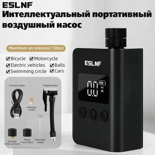 Удобный, занимает мало места, легко помещается в карман. Быстро накачивает. Быстро заряжается. Многофункциональное использование. Может создавать высокое давление, до 150 PSI. Электронасос ESLNF 19GW отлично подходит для накачки шин велосипедов, мотороллеров, электросамокатов и др.