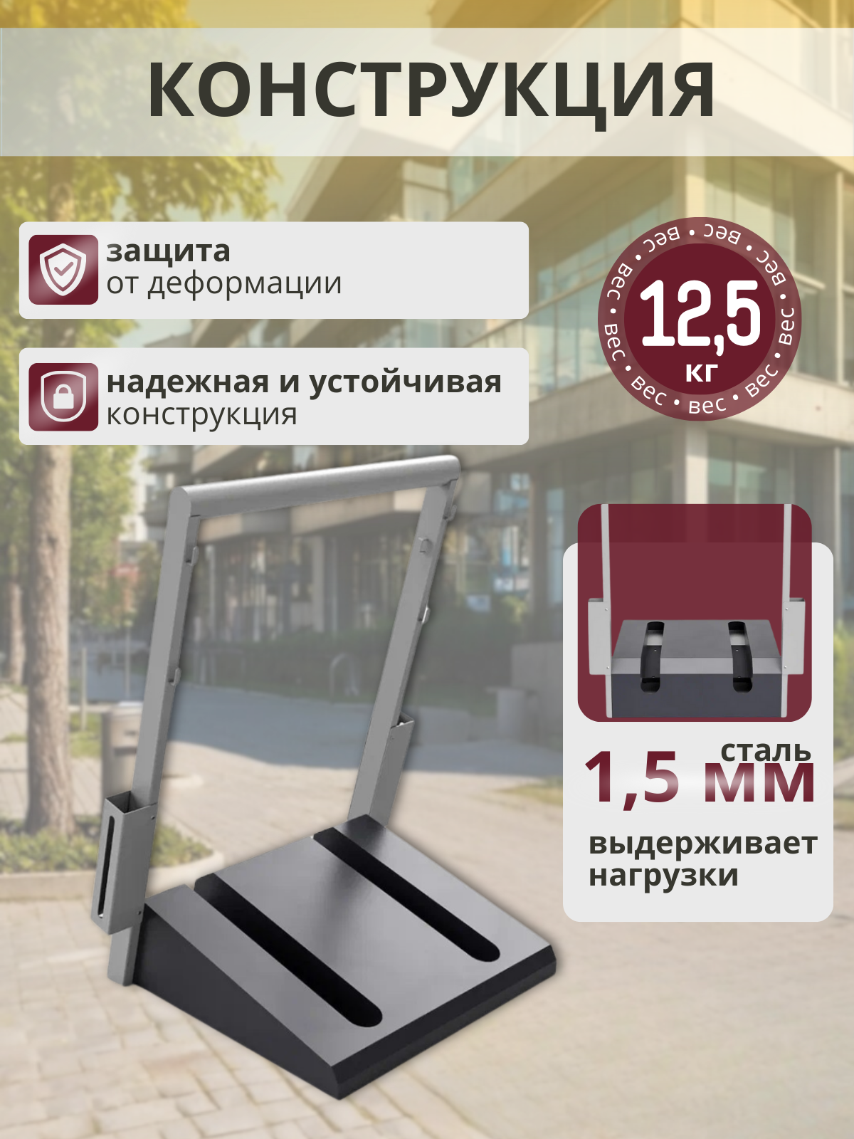 -Прочная и надежная конструкция – сталь 1,5 мм выдерживает значительные нагрузки. -Двойная антикоррозийная защита – грунтовка + полимерное порошковое покрытие. -Напольная установка – не требует крепления к стене, устойчива даже без фиксации. -Кронштейны для велоаксессуаров – удобное место для хранения шлемов, фонарей, замков. -Компактные габариты – легко размещается в ограниченном пространстве. -Широкая совместимость – подходит для различных типов велосипедов. Подходит для велосипедов: BMX Dirt/Street Горный Городской Гравийный Круизер Складной Гибрид Триальный Туристический Электровелосипед Четырехколесный Трехколесный Тандемный