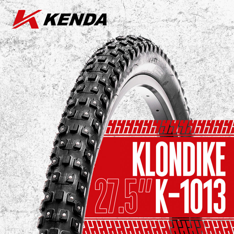 Шипованная велопокрышка Kenda Klondike, размер 27.5x2.10 (54-584), 4-х рядная, 368 стальных шипов, стальной корд, 60 TPI, устойчивость к проколам, рекомендуемое давление 40-65 PSI, примерный вес 1450 грамм.