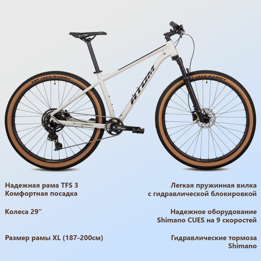 ATOM BION NINE LTD – спортивный маунтинбайк для тех, кому нужен быстрый велосипед для тренировок и первых соревнований. Лёгкая алюминиевая рама с применением тройного баттинга и внутренней проводкой. Амортизационная вилка с 32 мм ногами и надёжная неприхотливая трансмиссия Shimano 1x9 Cues 4000. Добавим надёжные гидравлические тормоза MT200 и перед нами то, что нужно для первых спортивных стартов и новых приключений.