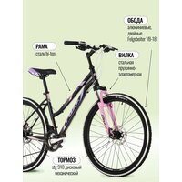 Foxx Latina 26" (2024) – женский велосипед со стальной заниженной рамой предназначен для прогулочного катания в городе и за его пределами . Пружинно-эластомерная амортизационная вилка с ходом 63 мм смягчит ощущения от неровностей на пути и сделает поездку комфортной. 18-скоростная (3x6) трансмиссия на компонентах Shimano Tourney позволяет подобрать оптимальную для своего стиля катания передачу практически в любых дорожных условиях. Дисковые механические тормоза STG 910 отвечают за безопасное и своевременное торможение. Двойные алюминиевые обода Felgebeiter в сочетании с покрышками ZX Sporter 2.0" со средним протектором обеспечивают велосипеду быстрый разгон, высокую прочность колес и отличную устойчивость на различных покрытиях.