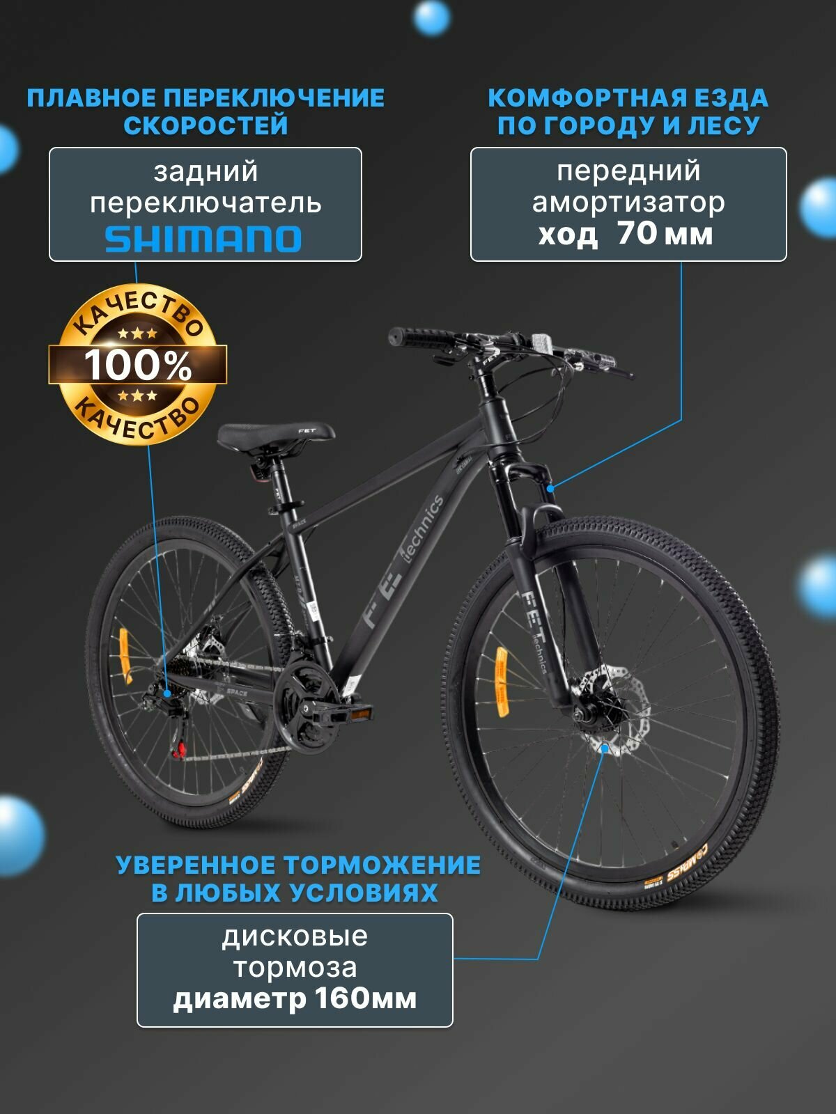 Купить Велосипед горный 26″, FET technics Space, черный серый, Shimano, дисковые тормоза с доставкой по всей России.