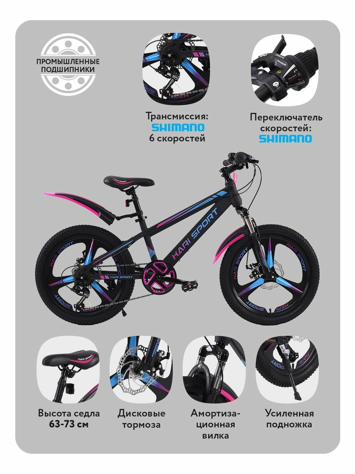 Велосипед KariKids оснащен 6 скоростями, трансмиссией и манеткой SHIMANO, что гарантирует высокую надежность и долговечность. Регулировка высоты седла (63-73 см) позволяет подобрать оптимальное положение для каждого ребенка.