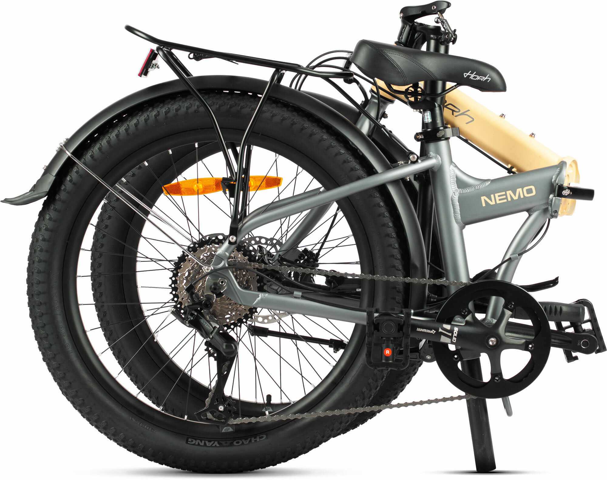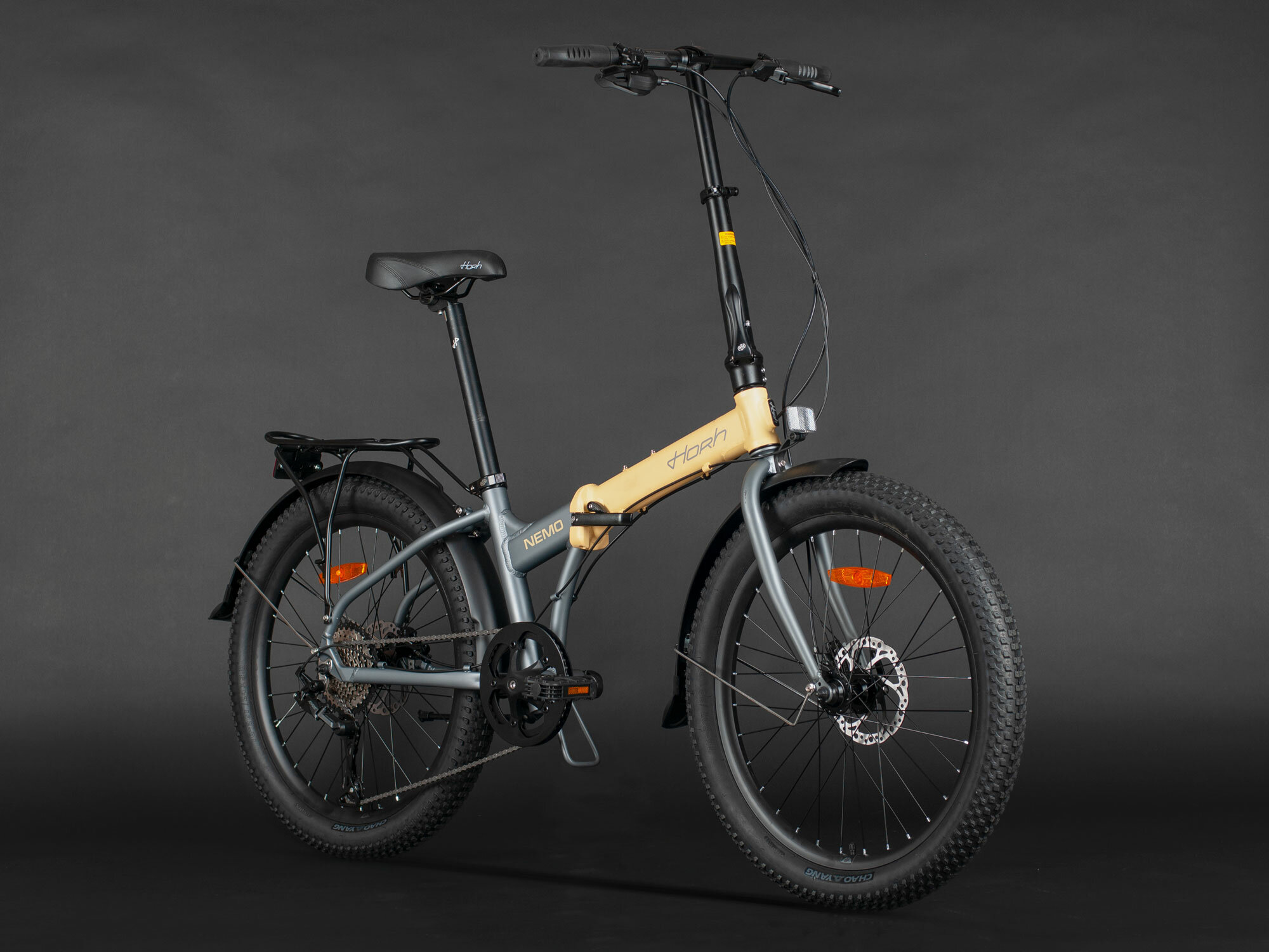 Новый складной велосипед Horh Nemo – крутой алюминиевый байк на 24" колесе. Данная модель оснащена дисковыми гидравлическими тормозами, группой оборудования Microshift Advent и трансмиссией на 9 скоростей. В комплектации у велосипеда установлены крылья, багажник, подножка – всё это отлично дополняет модель, как в визуальном плане, так и в функциональном.