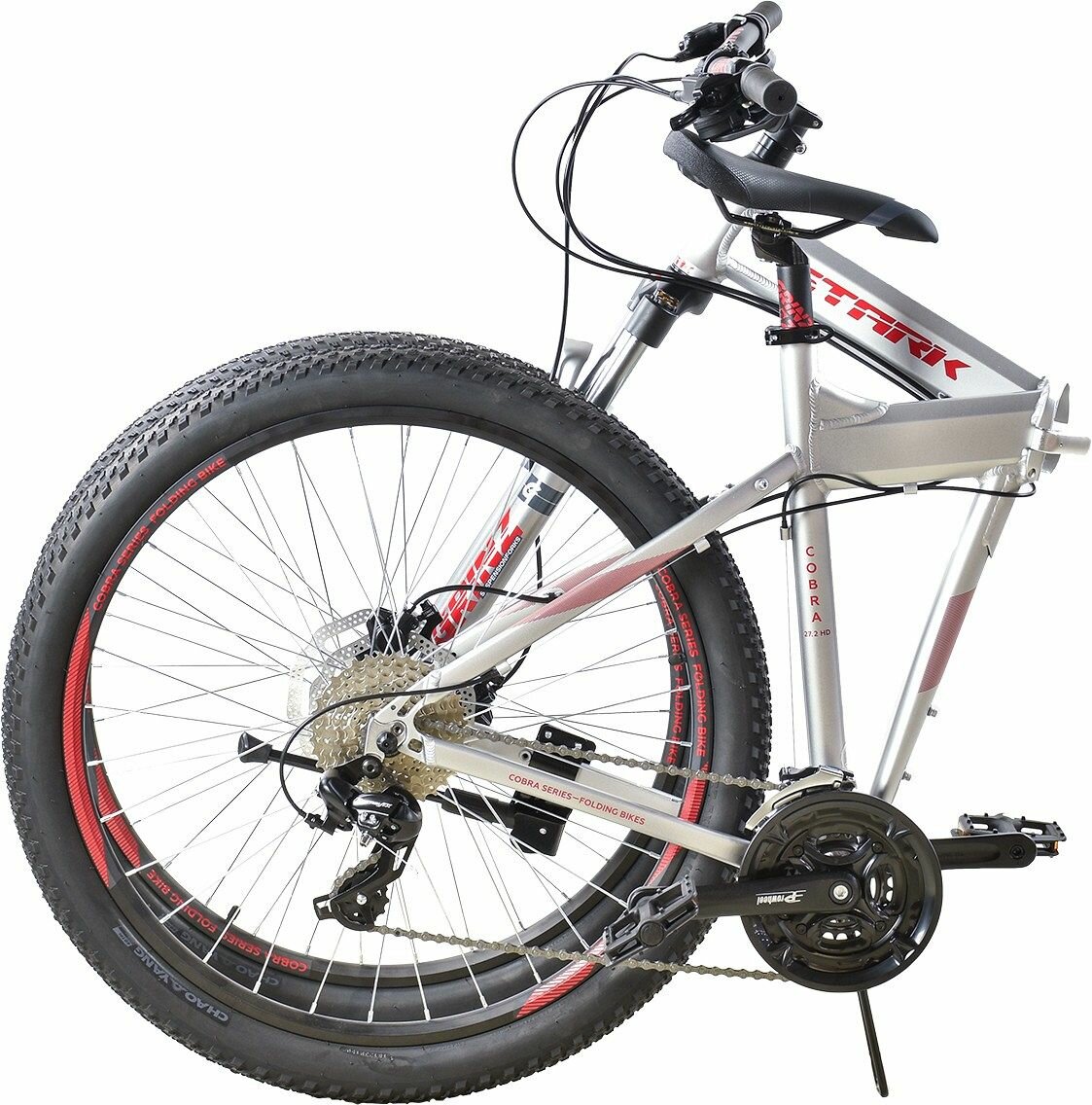 Stark Cobra 27.2 HD (2024) – складной прогулочный велосипед, который создан для катания по ровным городским велодорожкам и легкому бездорожью вне города. Обладает 24-скоростной трансмиссией (3*8) начального класса с переключателем Shimano Tourney. Технические характеристики: диаметр колес - 27.5-дюймов, алюминиевая рама, амортизационная пружинно-эластомерная вилка Grinz ES-451MLO с ходом 100 мм предварительной нагрузкой и блокировкой, двойные алюминиевые обода Qijian DH-18, дисковые гидравлические тормоза Tektro HD-M285, роторы 180/160 мм, подножка, покрышки Seyoun SY-B008 2.25".