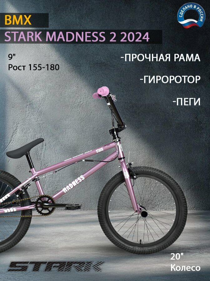 STARK Madness BMX 2 2024 - это идеальный выбор для любителей экстремального катания! Этот велосипед обладает прочной стальной рамой Hi-Ten 13A и надежной вилкой Stark Rigid, что делает его идеальным для выполнения различных трюков и прыжков.