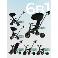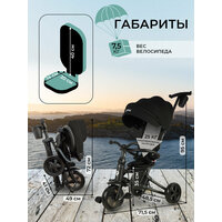 держатель для стакана/бутылки, 5-ти точечный ремень безопасности, регулируемая родительская ручка, регулируемая наклонная спинка сиденья, сиденье разворачивается на 360 градусов, функция свободного хода руля и переднего колеса, тормоза на задних колесах