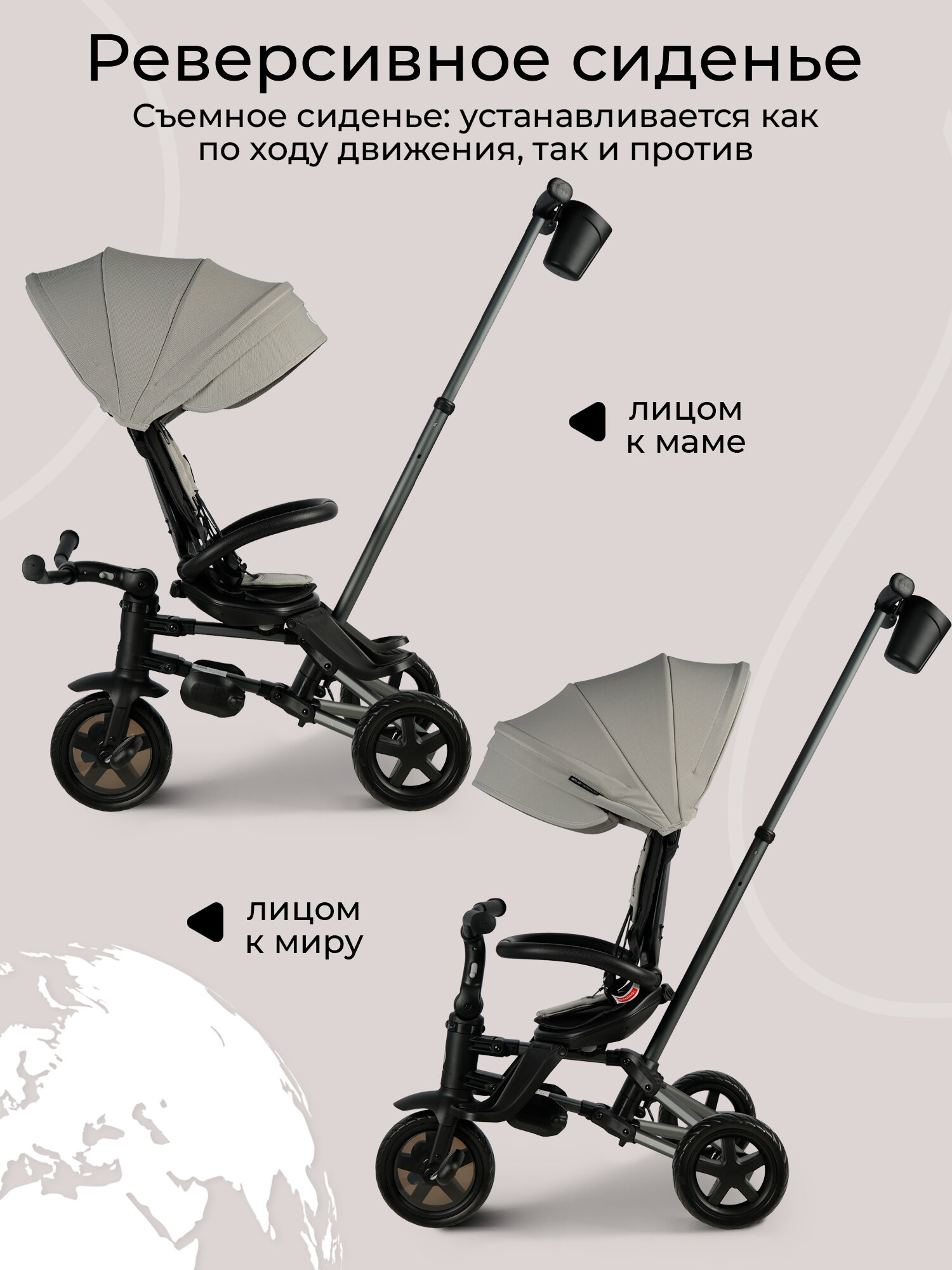 Реверсивное сиденье: можно установить как лицом к родителю, так и лицом к миру, что делает поездки комфортными и интересными.