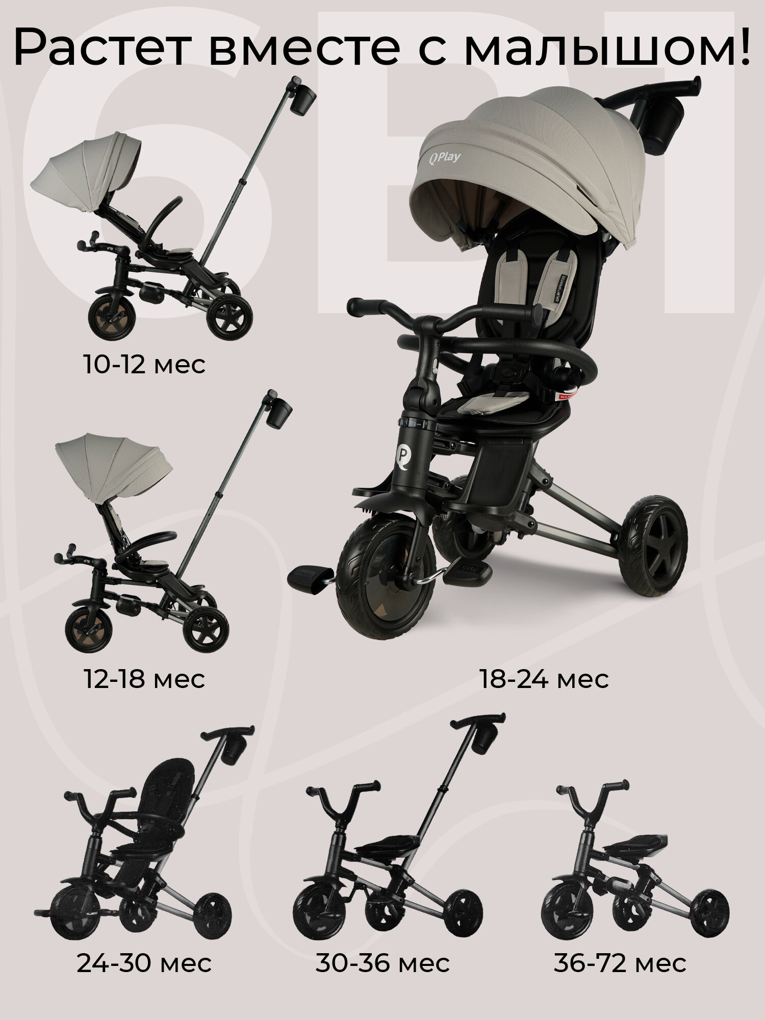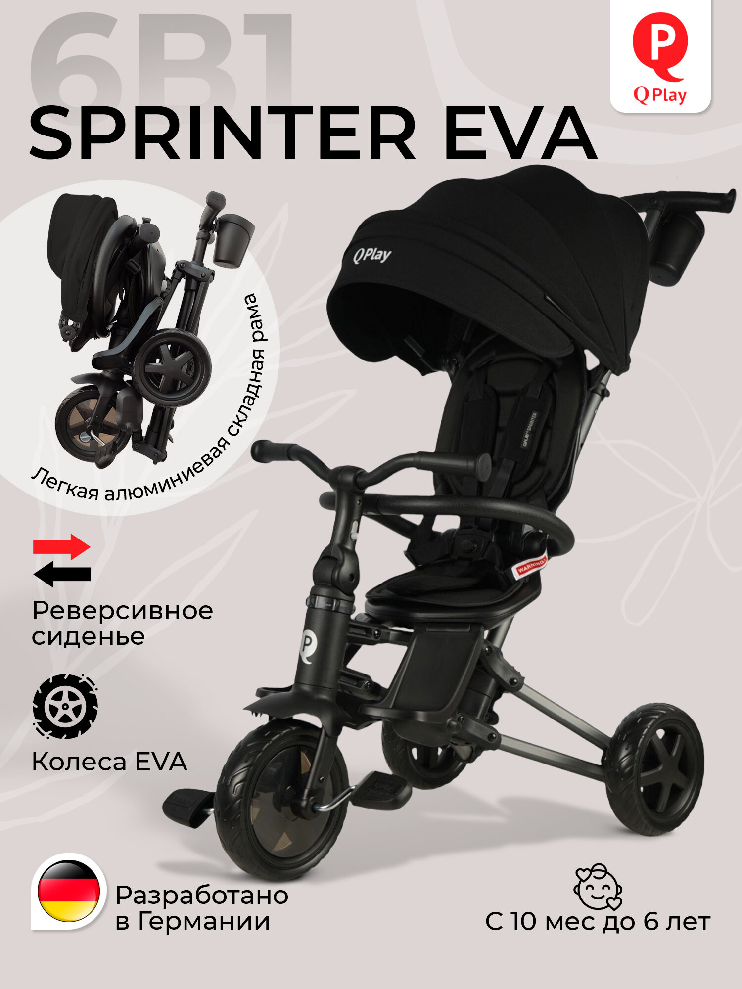 Трансформация: имеет 6 вариантов использования, адаптируясь к растущему ребенку, от фактической коляски до полноценного велосипеда, обеспечивая комфорт, безопасность и радость от прогулок на протяжении нескольких лет;