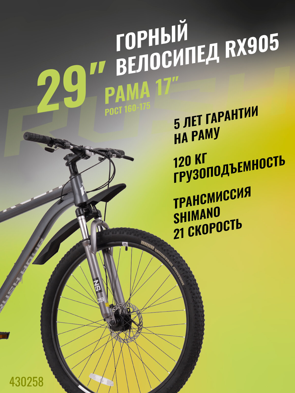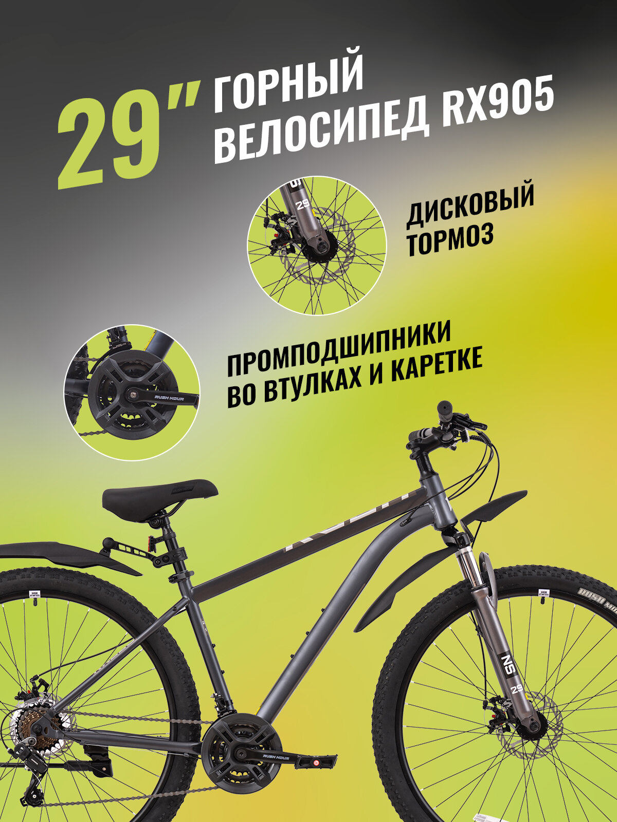 Велосипед взрослый горный дисковый 29″ RUSH HOUR RX 905 21 скорость графит рама 17″ рост 160-175 см. скоростной мужчине спортивный с амортизацией найнер переключатель SHIMANO: сравнение цен, характеристики, фото, актуальное наличие и цены.