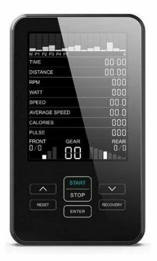 - Многофункциональный дисплей – отображает ключевые параметры тренировки: скорость, время, расстояние, пульс и потраченные калории.