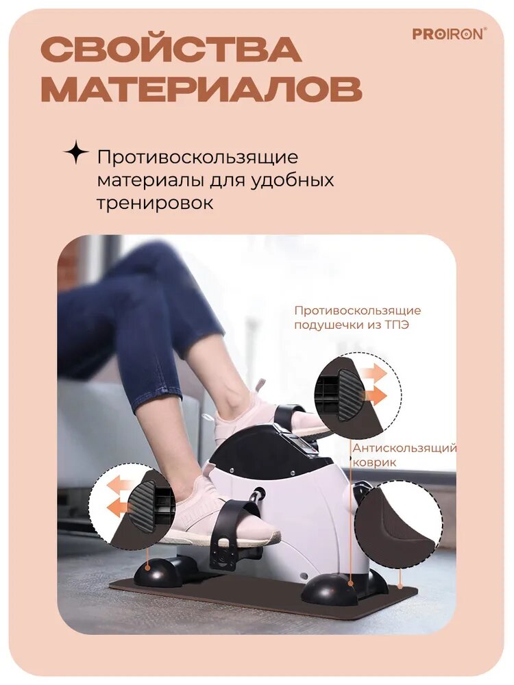 Велотренажер мини с дисплеем PROIRON - это компактный и удобный тренажер, предназначенный для тренировки рук и ног в любом месте и в любое время. Изготовленный из прочных материалов - металла, пластика и ПВХ, он имеет стильный бело-черный дизайн, что делает его привлекательным и современным. С размерами 40х35,5х30 см и в комплекте с ковриком из TPE 45х40 см, этот мини велотренажер легко помещается дома или в офисе, позволяя вам заботиться о своем здоровье в любой обстановке. В комплекте с тренажером поставляются также батарейка, гаечный ключ, отвертка/шестигранник, комплект винтов с шайбами и подробная инструкция, что обеспечивает удобство сборки и использования. Дисплей, встроенный в велотренажер для дома, отображает важные параметры тренировки: время, расстояние, подсчет вращений и калории, предоставляя вам полную информацию о ваших достижениях. Ручка регулировки нагрузки позволяет адаптировать тренировочную сессию под ваши физические потребности, делая этот велотренажер для рук и ног подходящим для различных уровней физической активности. Коврик с прорезиненной нескользящей поверхностью обеспечит уверенность и безопасность во время тренировок. Для тех, кто проходит реабилитацию после травм или операций, велотренажер может быть полезным инструментом для постепенного восстановления физической активности. Спортивный инвентарь PROIRON - отличное средство физической активности для пожилых людей, женщин и мужчин. Велотренажер для дома мини обеспечивает низкую интенсивность тренировки, что позволяет избежать излишнего напряжения на суставы и мышцы, что важно для людей с возрастными изменениями. Оснащен автоматическим включением при начале кручения педалей, работает от 1 батарейки типа ААА и предназначен для использования лицами весом до 150 килограмм. Мини велотренажер для ног и рук PROIRON идеальный выбор для тех, кто стремится поддерживать активный образ жизни, заботиться о своем здоровье и улучшать кровообращение в удобном формате, не зависимо от места пребывания.