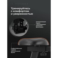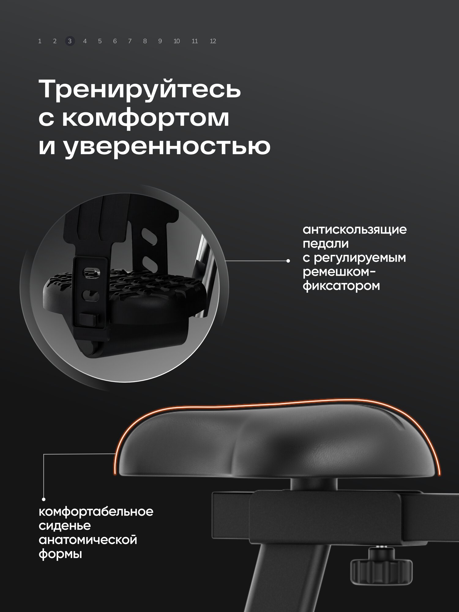 Вы можете легко настроить посадку под себя. Седло анатомической формы с регулировками по высоте и вылету помогает сохранить правильную геометрию движения. Руль с мягким покрытием комфортен при длительных заездах, антискользящие педали с регулируемыми ремнями фиксируют стопу и не дают ей соскальзывать даже на высоком темпе. Для установки велотренажера в любой комнате дома предусмотрены компенсаторы неровностей пола, а перекатить тренажер к стене или в другую комнату помогают ролики.