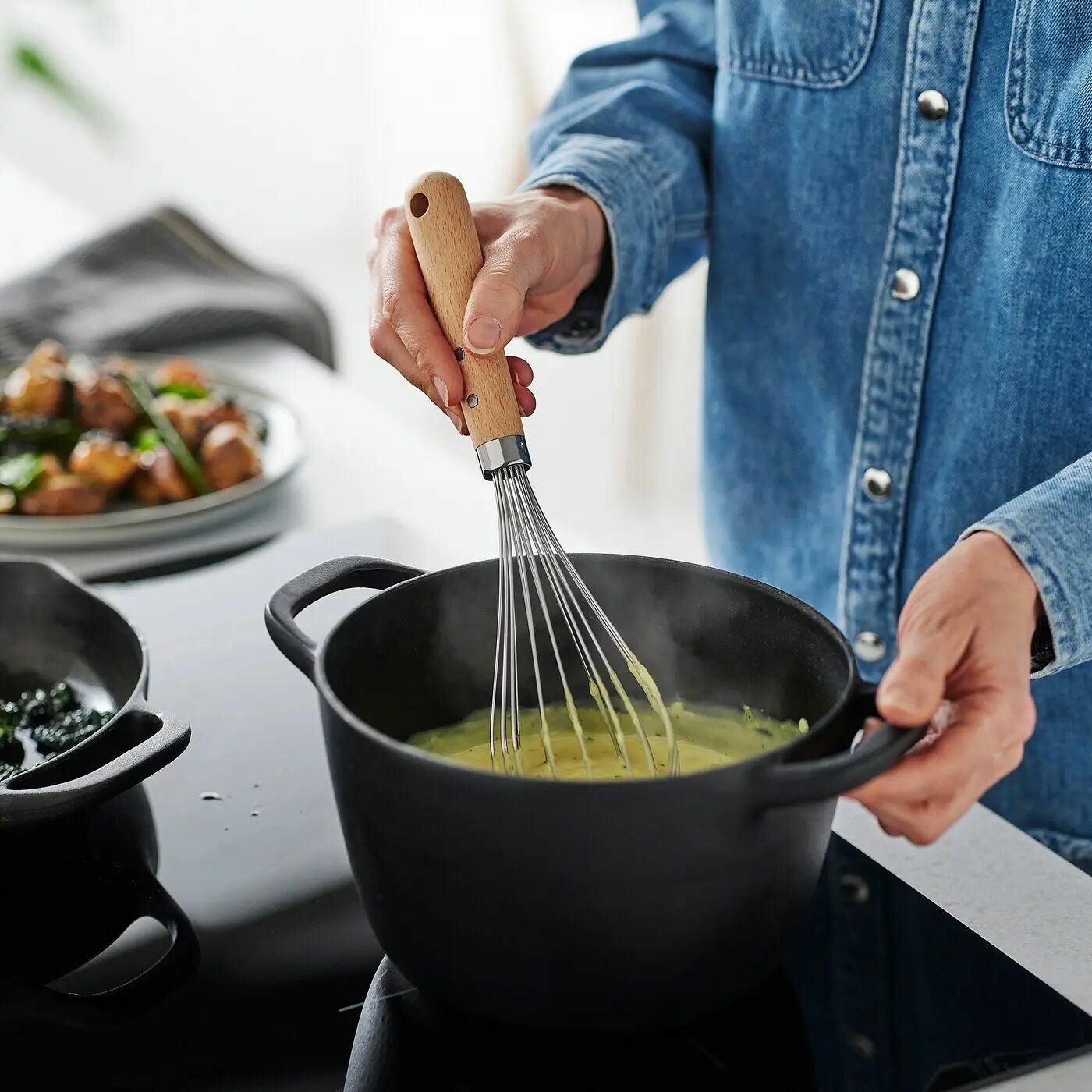 Венчик Вардаген 30см (IKEA VARDAGEN) изготовлен из нержавеющей стали и массива бука, что обеспечивает его долговечность и прочность. Округлая форма венчика позволяет достать до любого места в чаше, благодаря чему все ингредиенты тщательно перемешиваются.