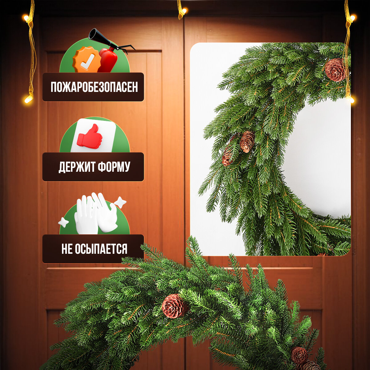 Венок новогодний на дверь выполнен из литой ПЭ и ПВХ, что обеспечивает его долговечность и устойчивость к внешним воздействиям. Материал не теряет форму и цвет, а также не вызывает аллергии.