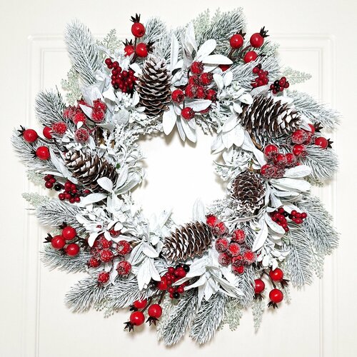 Наш новогодний венок, выполненный из натуралистичных литых еловых лапок, ягод, веточек и еловых шишек, уже с порога дома наполнит Вас ощущением приближающегося волшебного праздника.