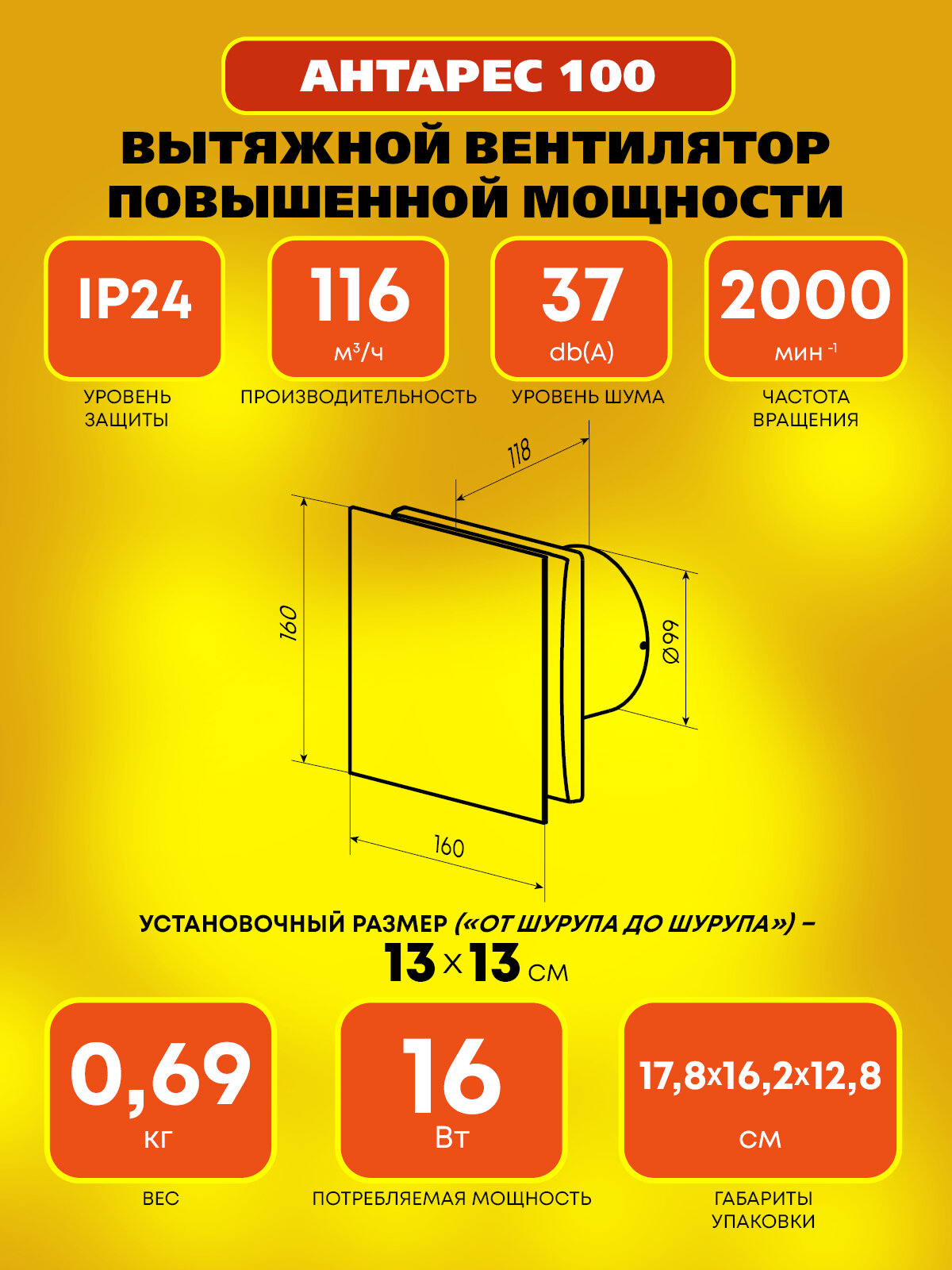 Вентилятор 100 Антарес повышенной мощности, 16 Вт, 37 дБ, 116 м3/ч, песочный: сравнение цен, характеристики, фото, актуальное наличие и цены.