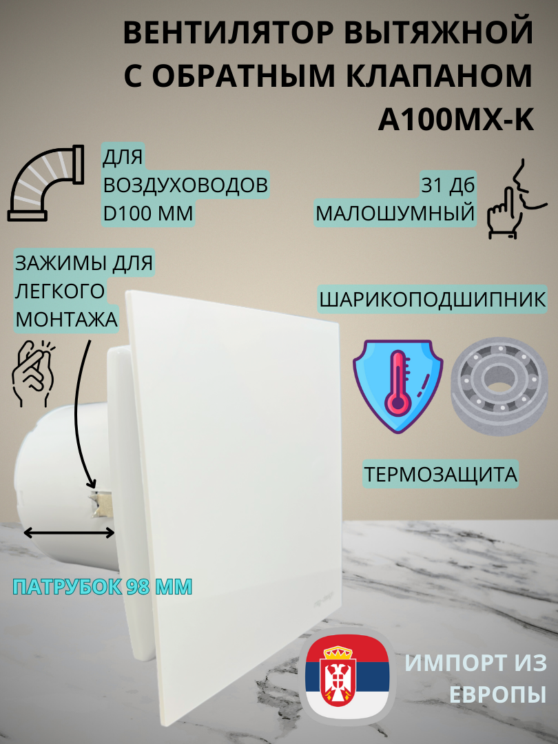 Вентилятор D100мм с плоской пластиковой панелью белого цвета, с обратным клапаном и креплением без сверления A100МX-PL, Сербия: сравнение цен, характеристики, фото, актуальное наличие и цены.