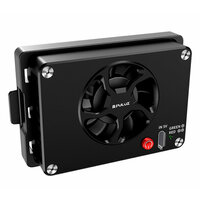 Долгое нажатие на кнопку питания включает и выключает вентилятор, короткие нажатия переключают скорость работы. Светодиодный индикатор показывает выбранный режим: зеленый свет – низкая скорость, красный свет – высокая скорость. Конструкция обеспечивает плотное прилегание вентилятора к корпусу камеры для максимально эффективного охлаждения.