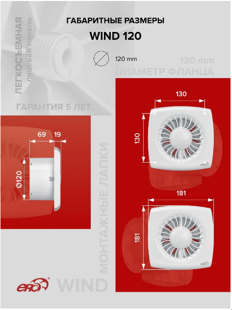 WIND имеет монтажные лапки, которые обеспечивают легкую и быструю установку вентилятора в шахту, стену и потолок. Лапки прочно удерживают устройство, упрощая монтаж. Вентилятор оснащен легкосъемной панелью, что облегчает его установку и очистку.