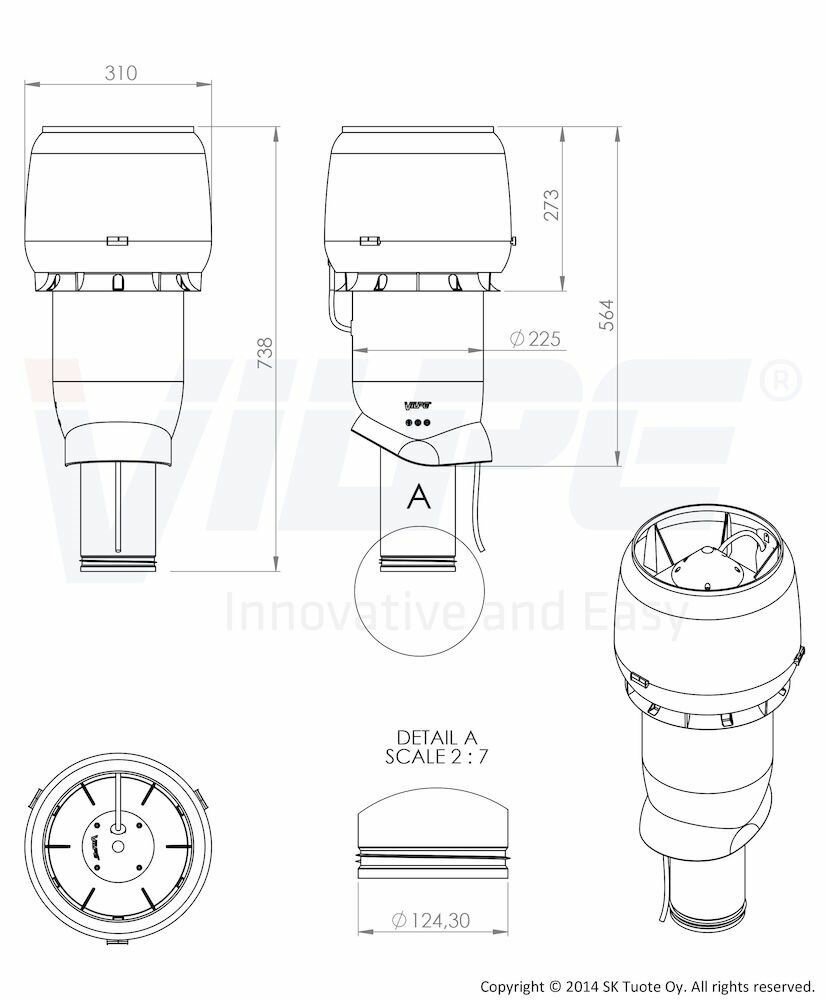 Кровельный вентилятор VILPE ECo190P/125/500 представляет собой трубу с колпаком, в который встроен вентилятор с двигателем постоянного тока.