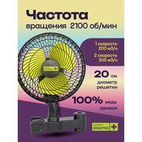 CLIP FAN оснащен защитной решеткой диаметром 200 мм. Вращающаяся ось обеспечивает равномерное распределение воздушного потока и эффективную вентиляцию.