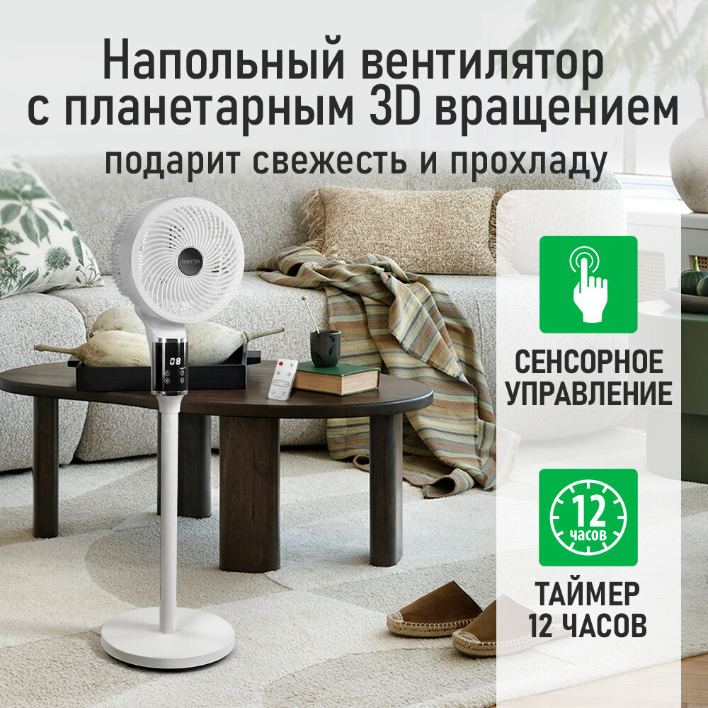 Купить Вентилятор напольный MARTA MT-FN5009B, 12 скоростей, дисплей, пульт, таймер, белый с доставкой по всей России.