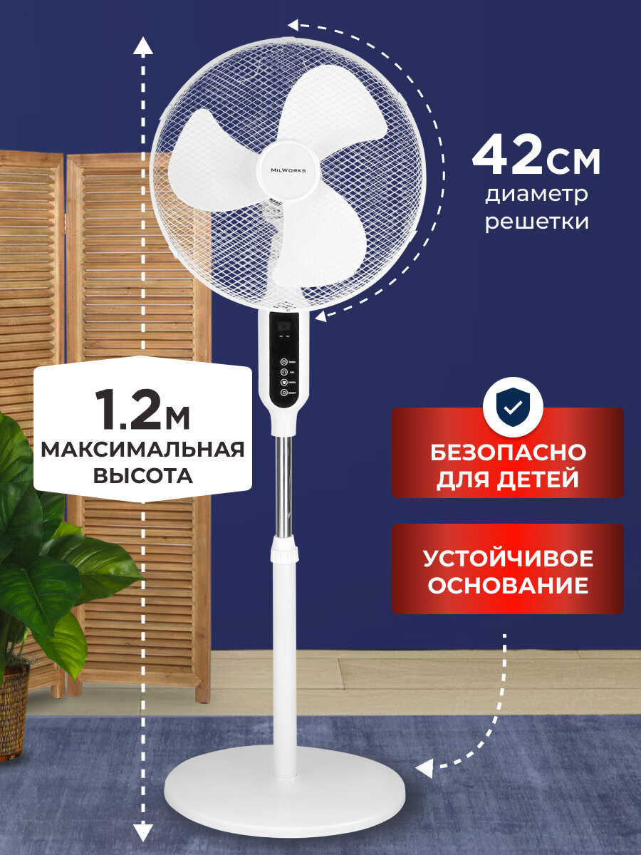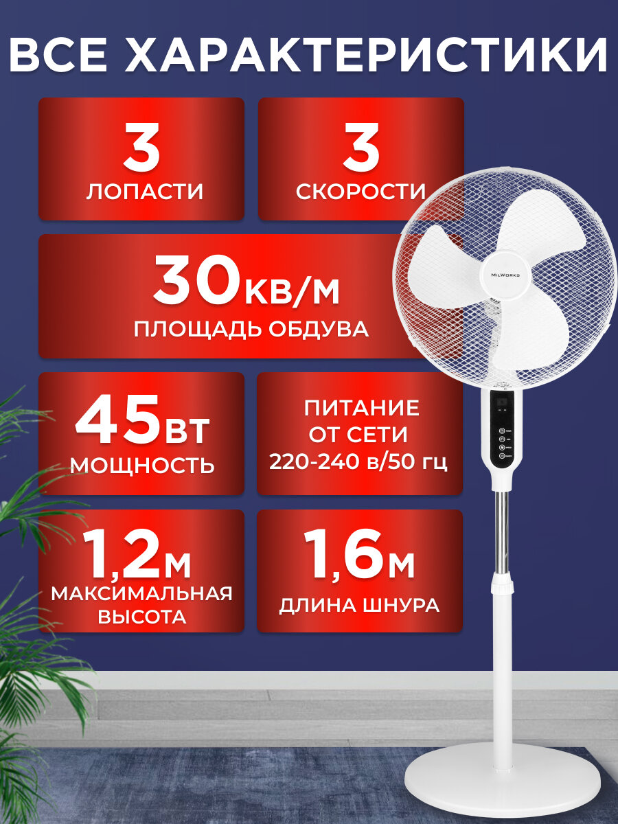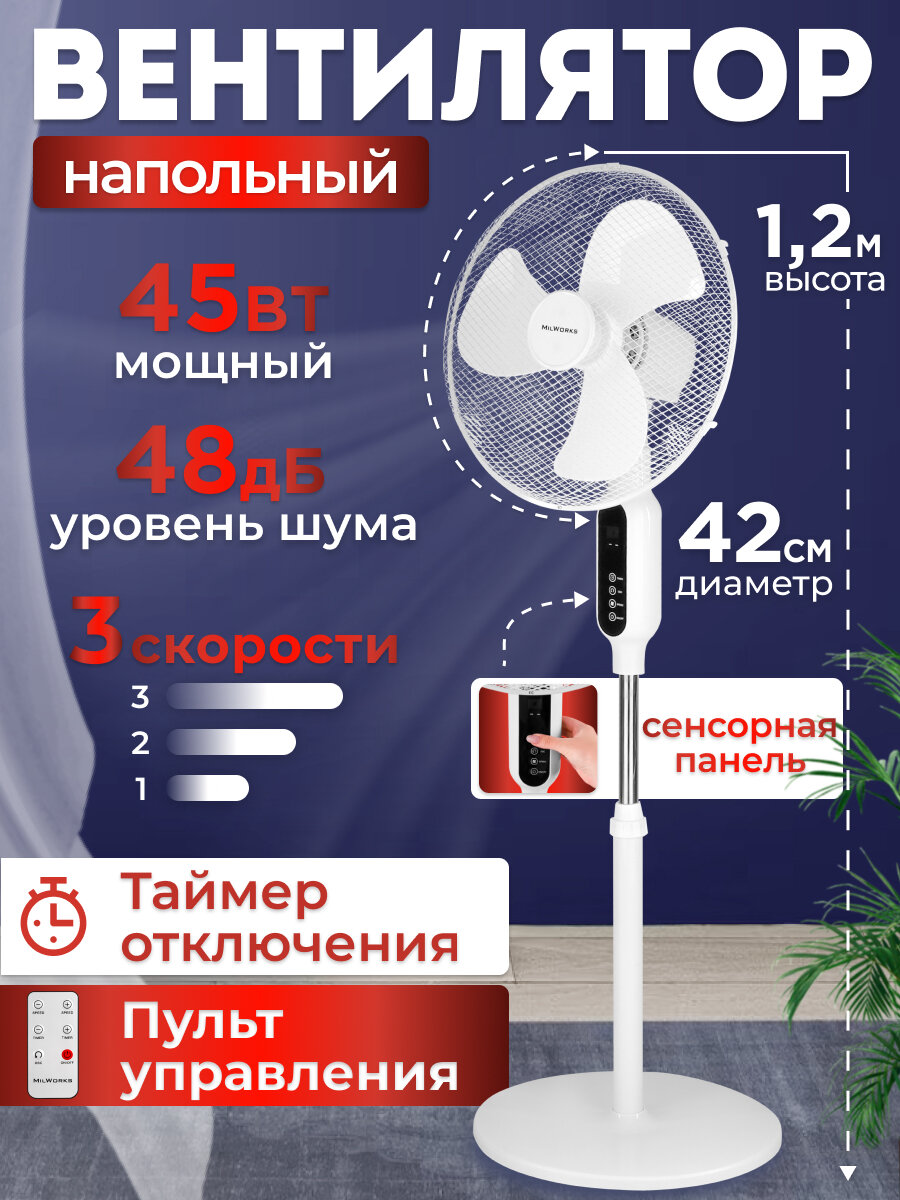 Вентилятор напольный сенсорный, 3 скорости, 3 лопасти, 45Вт, 120см, белый, пульт ДУ, MW SF-4144: сравнение цен, характеристики, фото, актуальное наличие и цены.