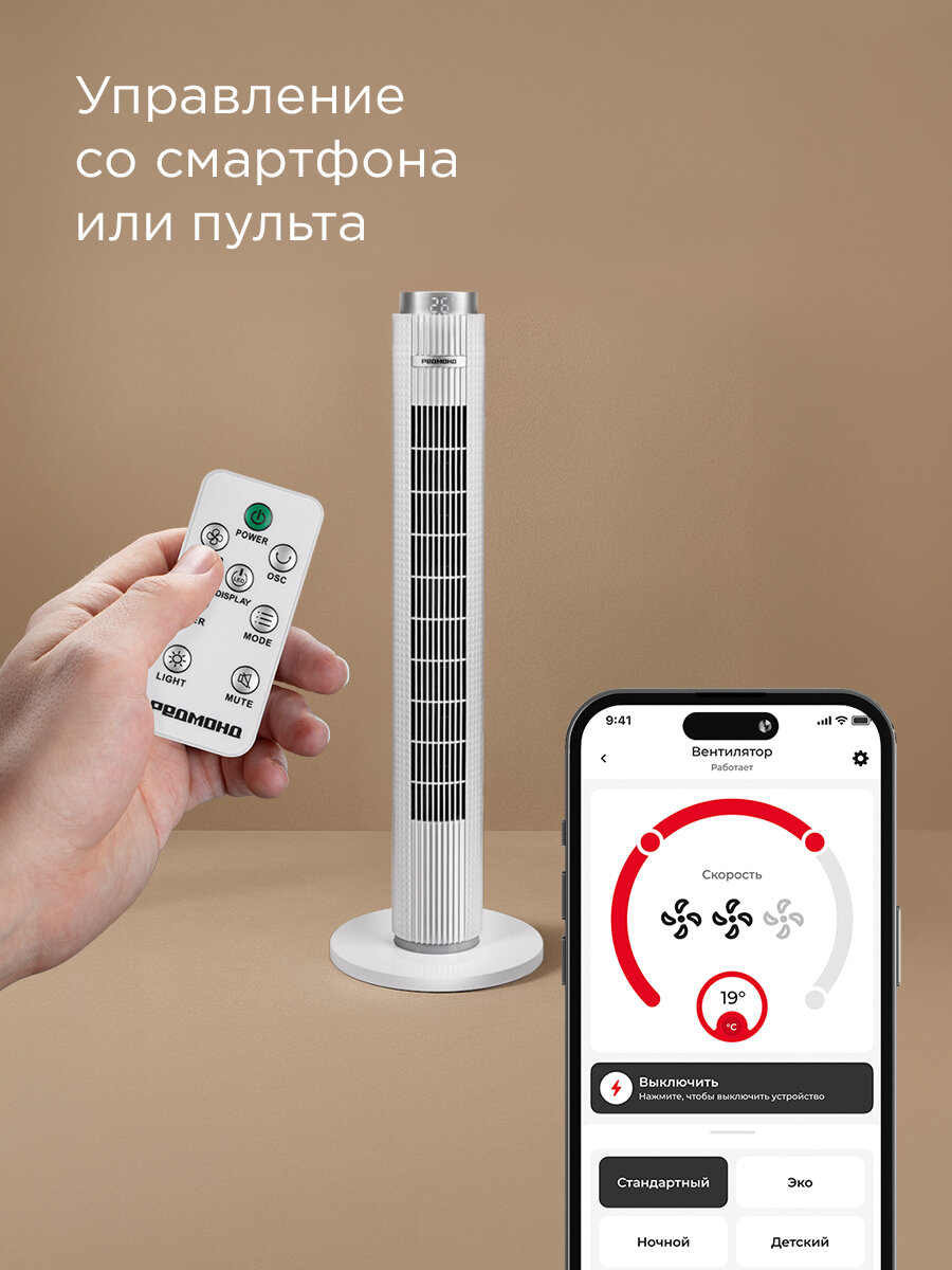 Теперь можно не подходить к вентилятору, чтобы переключить режим или скорость. Управляйте AP2215S без лишних движений с помощью пульта дистанционного управления или приложения R4S редмонд на вашем смартфоне.