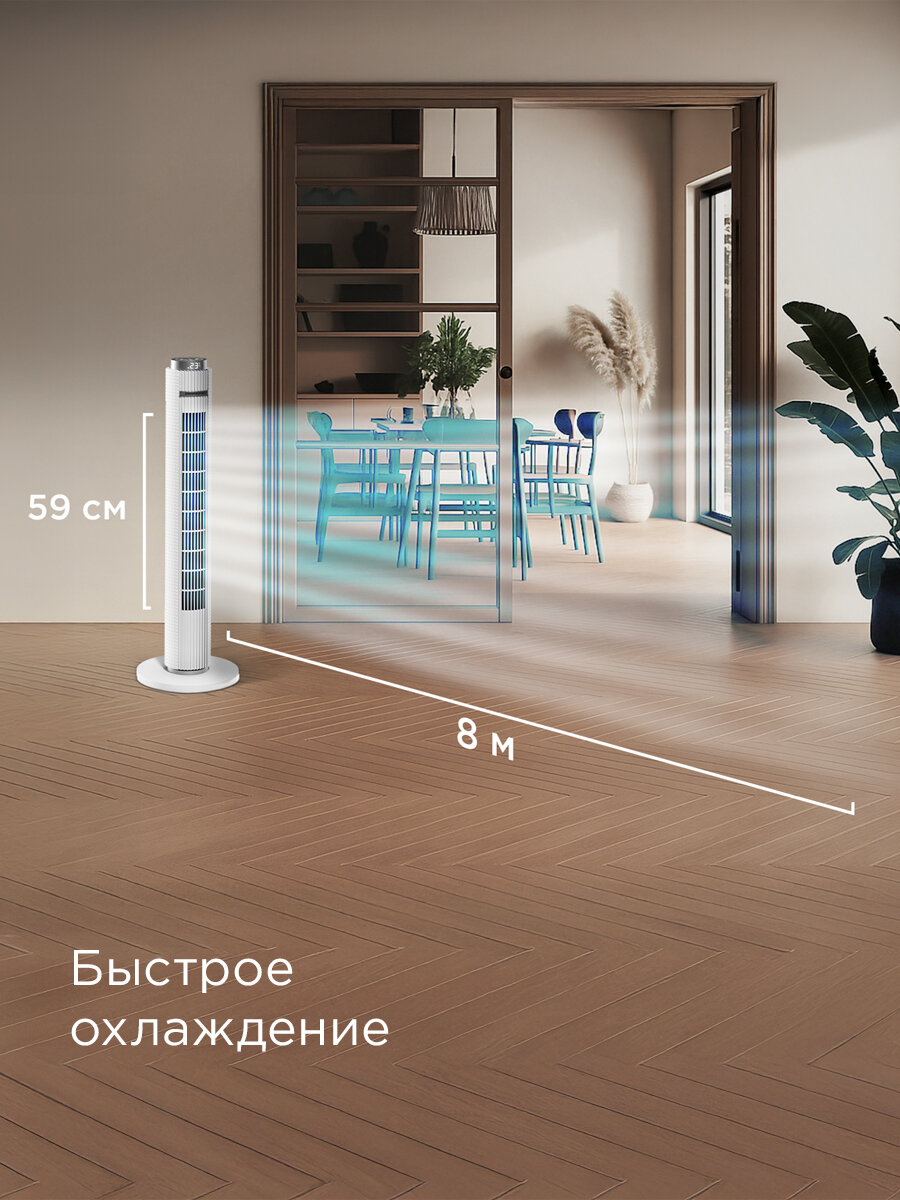 Благодаря расстоянию обдува до 8 метров и размеру воздуховода 59 см вентилятор быстро распространяет прохладный воздух по всей комнате. Такие параметры идеально подойдут как для квартиры, так и для большого дома.