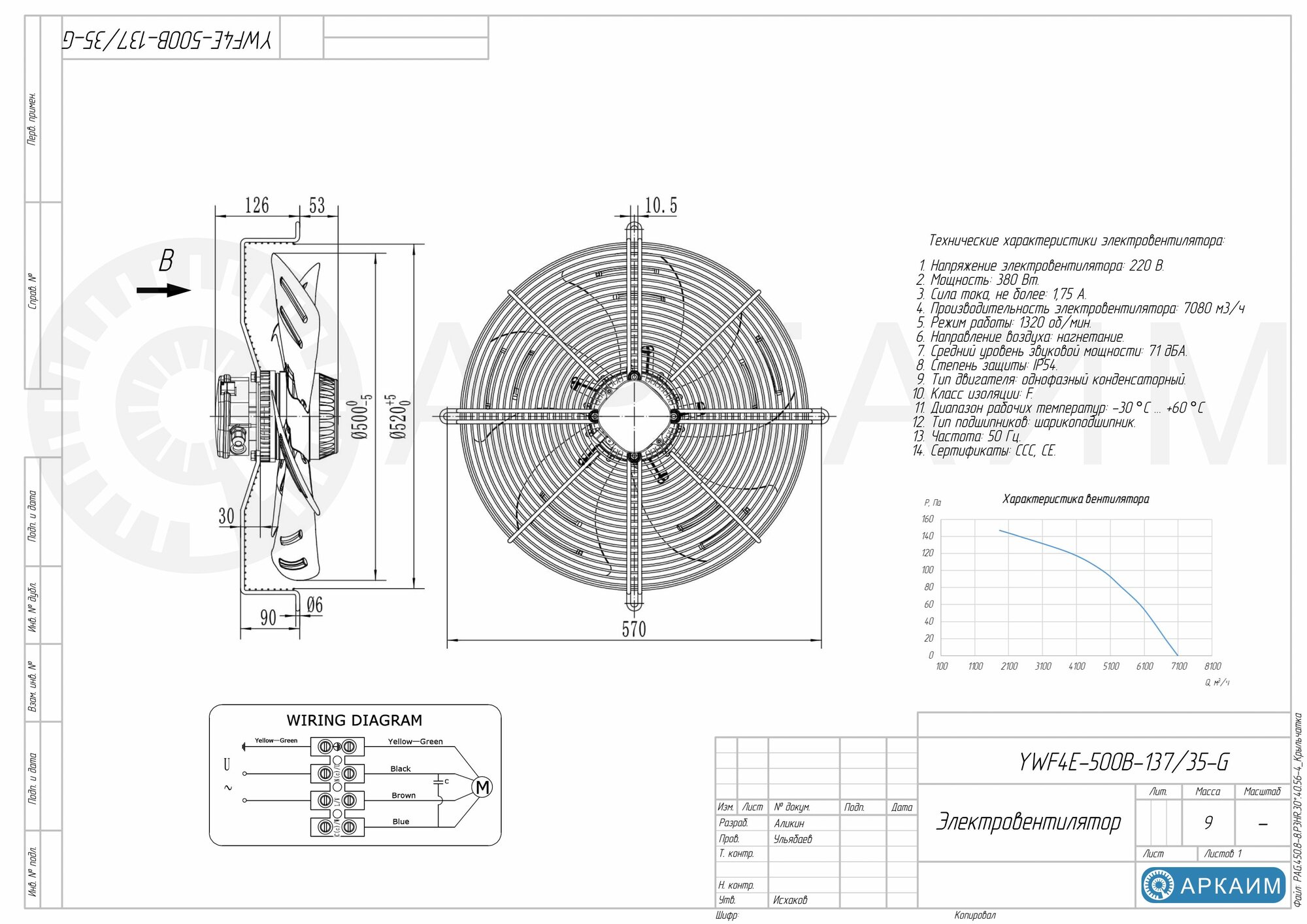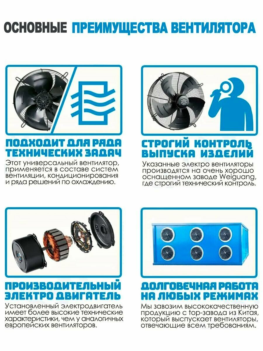Вентилятор Weiguang YWF4E-500В-137/35-G комплектуется двухфазный малошумным электродвигателем с 4 полюсами, параметры входного напряжения: 220 В/50 Гц. Данная модель вентилятора работает на нагнетание (на радиатор) и может создать максимальный поток воздуха, равный 7155 м3/час.