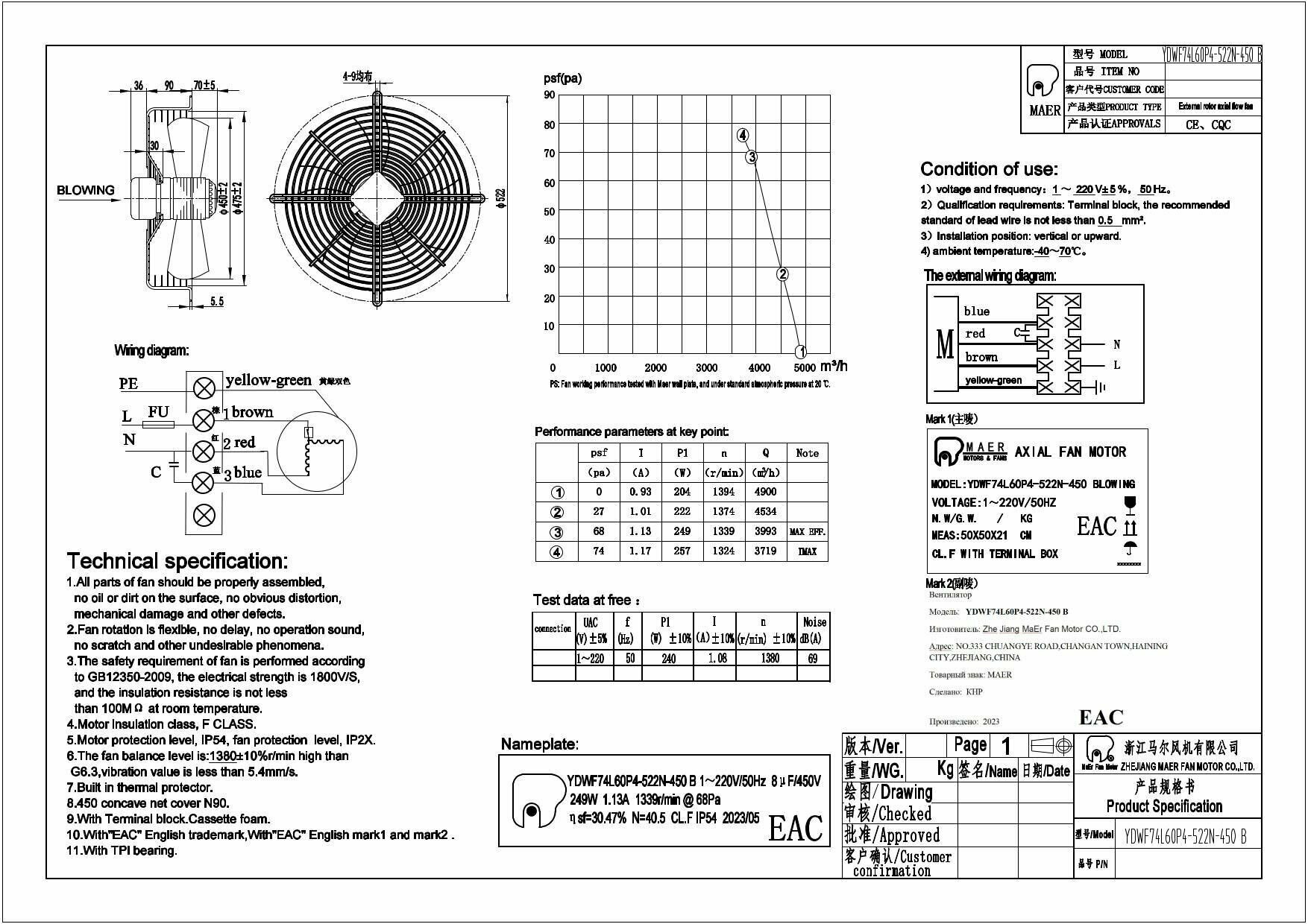 Вентилятор осевой YDWF74L60P4-522N-450 B MAER нагнетающий 4900 м3/час