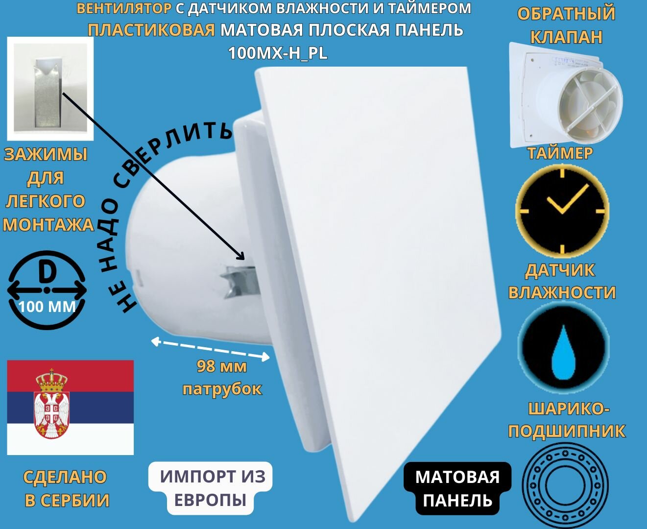 Вентилятор с таймером и датчиком влажности, D100мм, с матовой белой плоской пластиковой панелью, с обратным клапаном и креплением без сверления EXTRA100MX-H+PL-PVC WHITE, Сербия: сравнение цен, характеристики, фото, актуальное наличие и цены.