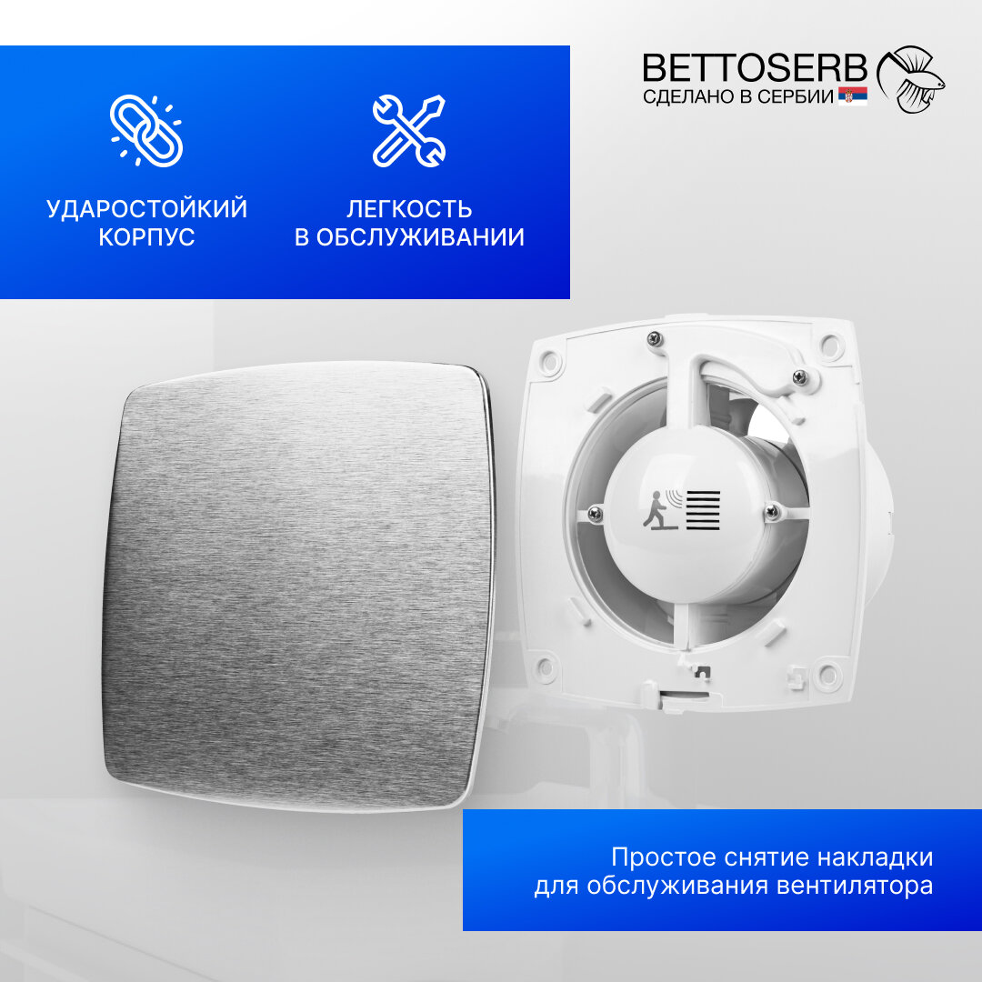 Вентилятор вытяжной бесшумный для ванной/туалета/кухни BETTOSERB с обратным клапаном, датчиком движения и таймером, c накладкой сталь: сравнение цен, характеристики, фото, актуальное наличие и цены.