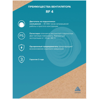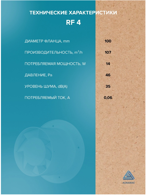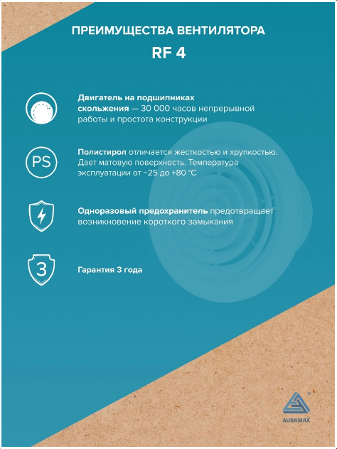 Вентилятор AURAMAX RF 4 оснащен двигателем на подшипниках скольжения, что гарантирует его надежность и долговечность. Он также имеет степень защиты IP 24, что означает защиту от пыли и влаги.