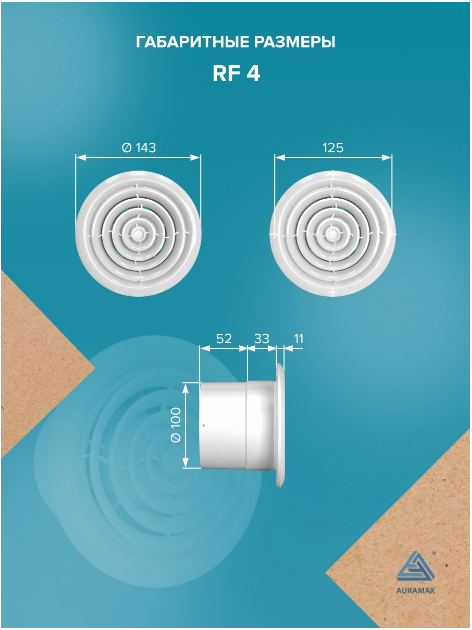 Вытяжной вентилятор AURAMAX 100 RF 4, который является идеальным решением для ванных комнат, кухонь и туалетов. Этот вентилятор обладает современным дизайном, который идеально сочетается с любым интерьером. Он имеет установочный диаметр 100 мм и рабочий механизм осевой, что обеспечивает высокую эффективность работы.