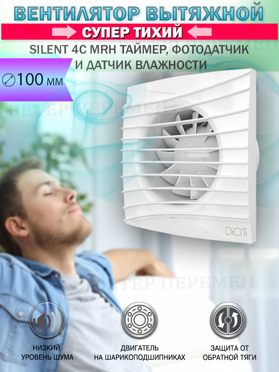 Купить Вентилятор вытяжной Diciti SILENT 4C MRH, с обратным клапаном, с таймером, датчиком света и влажности, бесшумный, D 100 мм, с доставкой по всей России. Вентилятор вытяжной Diciti SILENT 4C MRH, с обратным клапаном, с таймером, датчиком света и влажности, бесшумный, D 100 мм,: сравнение цен, характеристики, фото, актуальное наличие и цены.