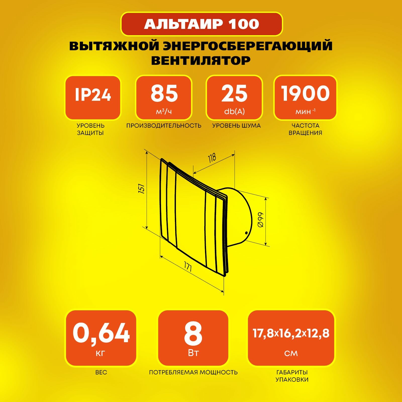 Вентилятор вытяжной Рвс Альтаир 100 энергосберегающий, 8 Вт, 25 дБ, 85 м3/ч: сравнение цен, характеристики, фото, актуальное наличие и цены.