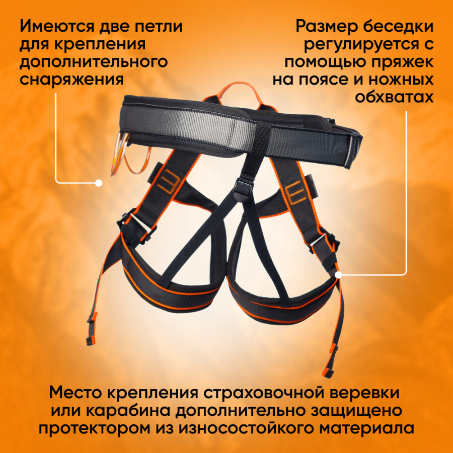Классическая регулируемая поясная беседка для занятий спортивным туризмом и скалолазанием. Имеет широкий диапазон регулировок. Одна быстрозажимная пряжка на поясе. Место крепления страховочной веревки или карабина дополнительно защищено протектором. Ножные петли регулируются с помощью быстрозажимных пряжек. Две петли для крепления дополнительного снаряжения. Разрывная нагрузка: не менее 15 кнгост Р ЕН 81302008 EN813Вес, г - 410