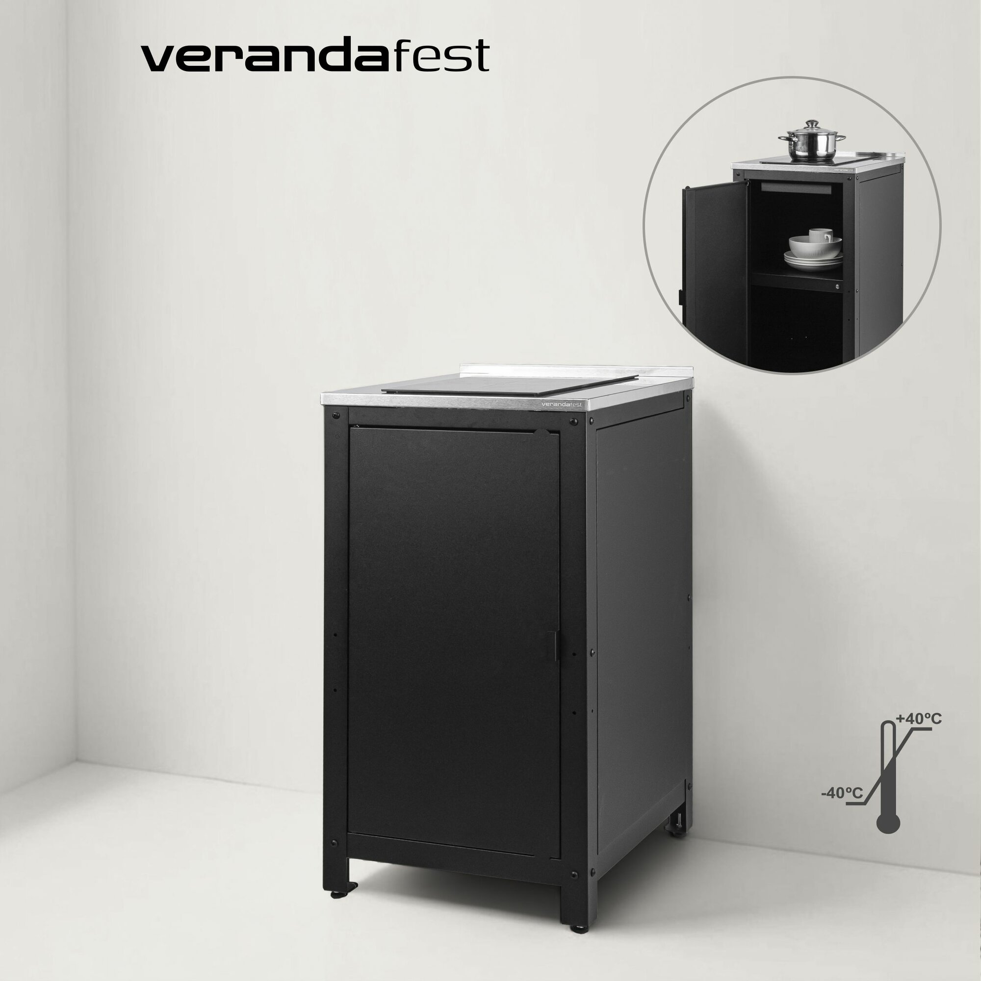 Не включает в себя плиту. Столешница традиционно изготовлена из нержавеющей стали, что значительно упрощает процесс очистки после приготовления блюд. Внутри модуля имеется две полки, их использование позволит убрать кастрюли, сковородки и другие полезные предметы. Дверь надежно закрывается с помощью магнитов. На задней стенке выполнены вентиляционные отверстия, обеспечивающие циркуляцию горячего воздуха, что предотвращает перегрев модуля и плиты. Плита в нижней части и с боковых сторон полностью защищена защитным кожухом, исключая возможность случайного контакта во время использования.