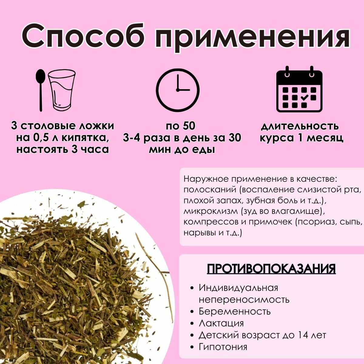 Применение: 3 ст. л. измельченного сырья положить в термос и залить 0,5 л кипящей воды. Дать настояться в течение трех часов, затем процедить через сито. Принимать внутрь в теплом виде.