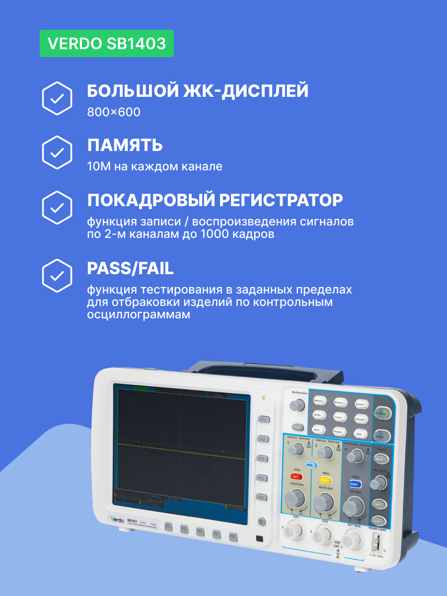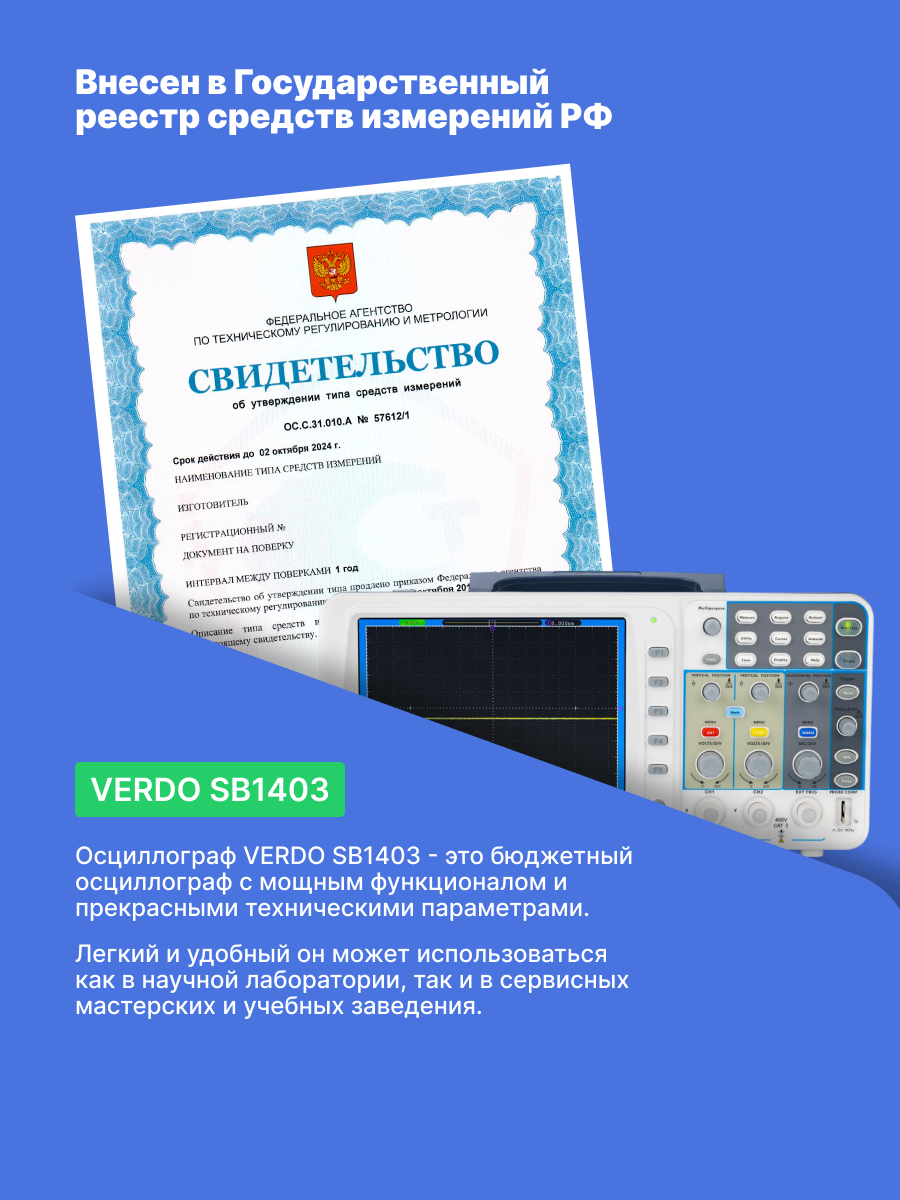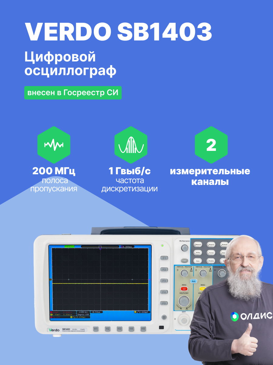 VERDO SB1403 Осциллограф цифровой запоминающий 2 канала, 200МГц, 1Гвыб/с Госреестр СИ: сравнение цен, характеристики, фото, актуальное наличие и цены.