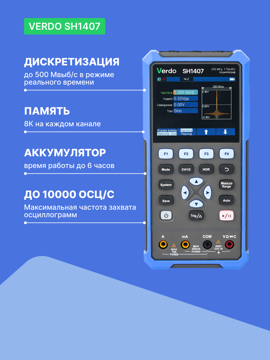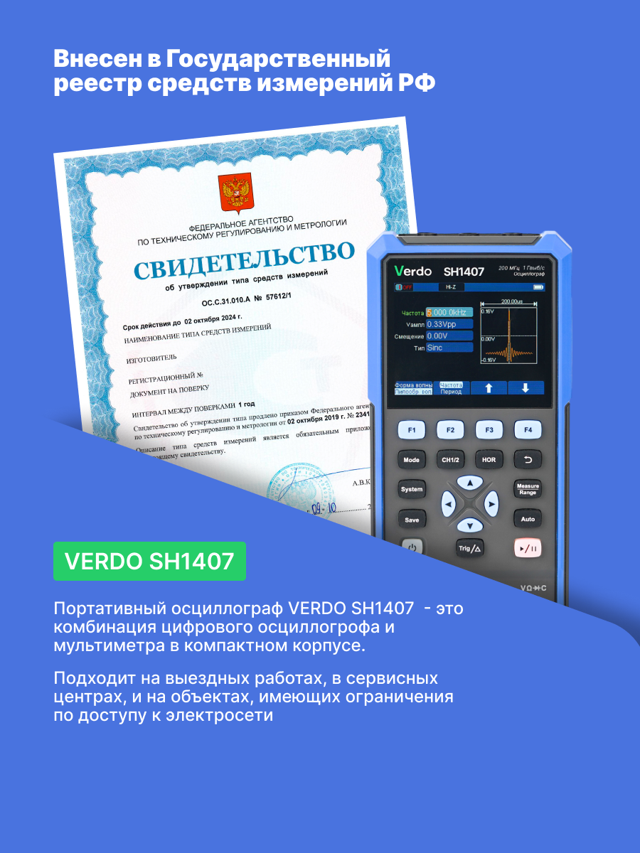 Купить VERDO SH1407 Осциллограф-мультиметр портативный 200 МГц, 2 канала Госреестр СИ с доставкой по всей России.