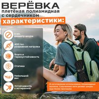 Веревка имеет диаметр 6 мм и разрывную нагрузку 380 кгс, что делает ее подходящей для использования в такелажных работах.