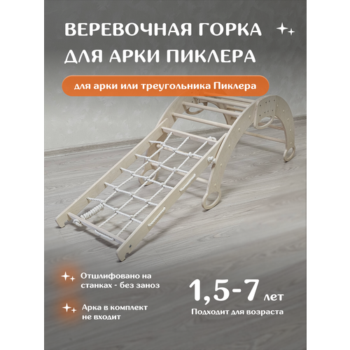 Веревочная горка для спортивных комплексов таких как арка Пиклера, треугольник Пиклера. Так же если у Вас установлена в детской шведская стенка, то Вы с лёгкостью сможете установить горку на неё. Вам лишь необходимо убедиться в том, что толщина палки не более 25 мм. Детский спортивный снаряд легко пристыковывается к спортивному комплексу для малышей за 1 движение. Каркас сделан из фанеры для детской мебели 15 мм толщикой и 10 мм хлопчатобумажного каната.