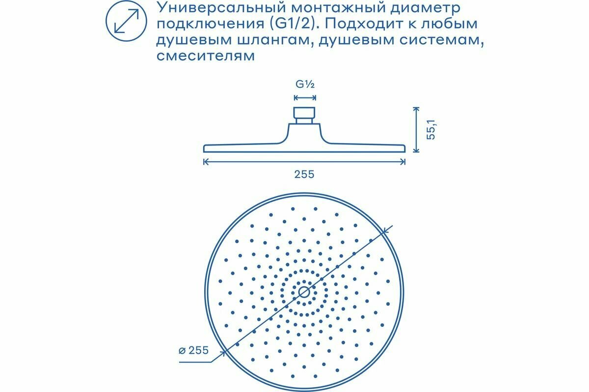 У лейки универсальный подсоединительный диаметр подключения: подходит для любых современных шлангов, смесителей и душевых систем.