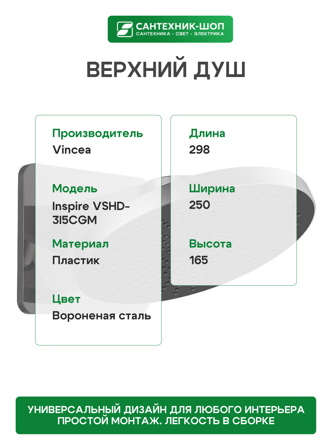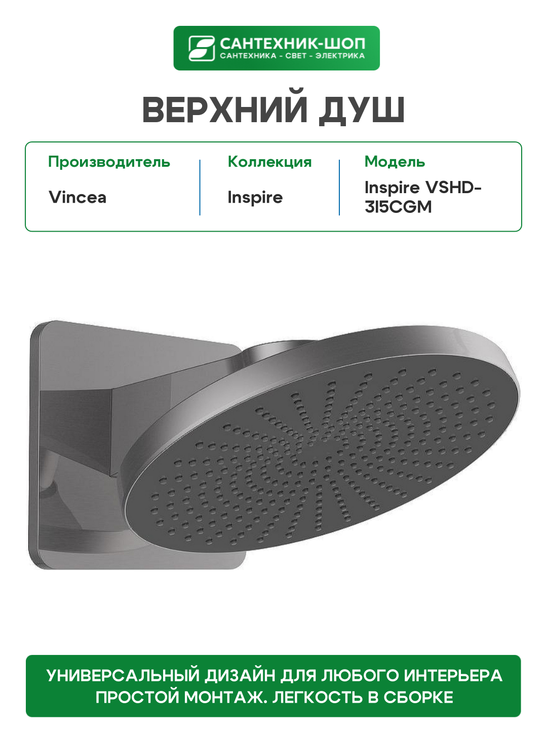 Верхний душ Vincea Inspire VSHD-3I5CGM, нержавеющая сталь, вороненая сталь: сравнение цен, характеристики, фото, актуальное наличие и цены.